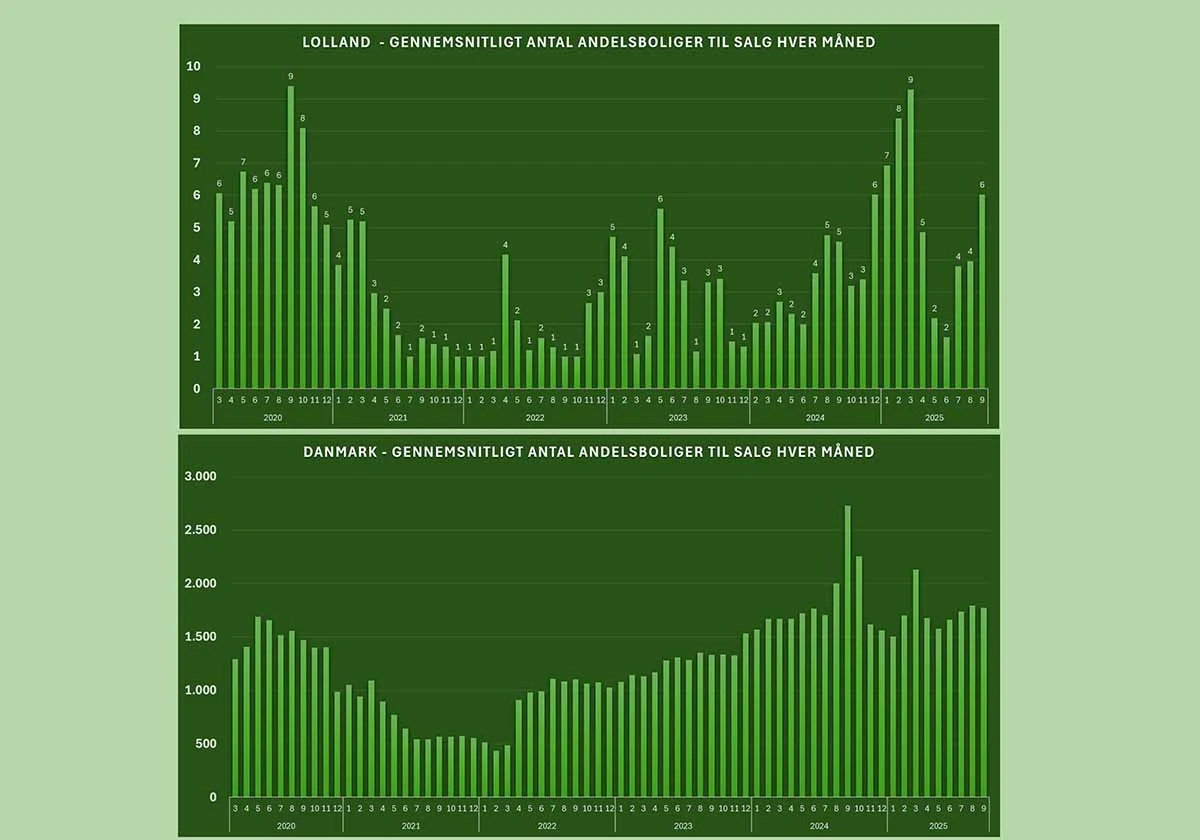 2 grafer viser det gennemsnitlige antal andelsboliger til salg hver måned i 5 år for Lolland og Danmark