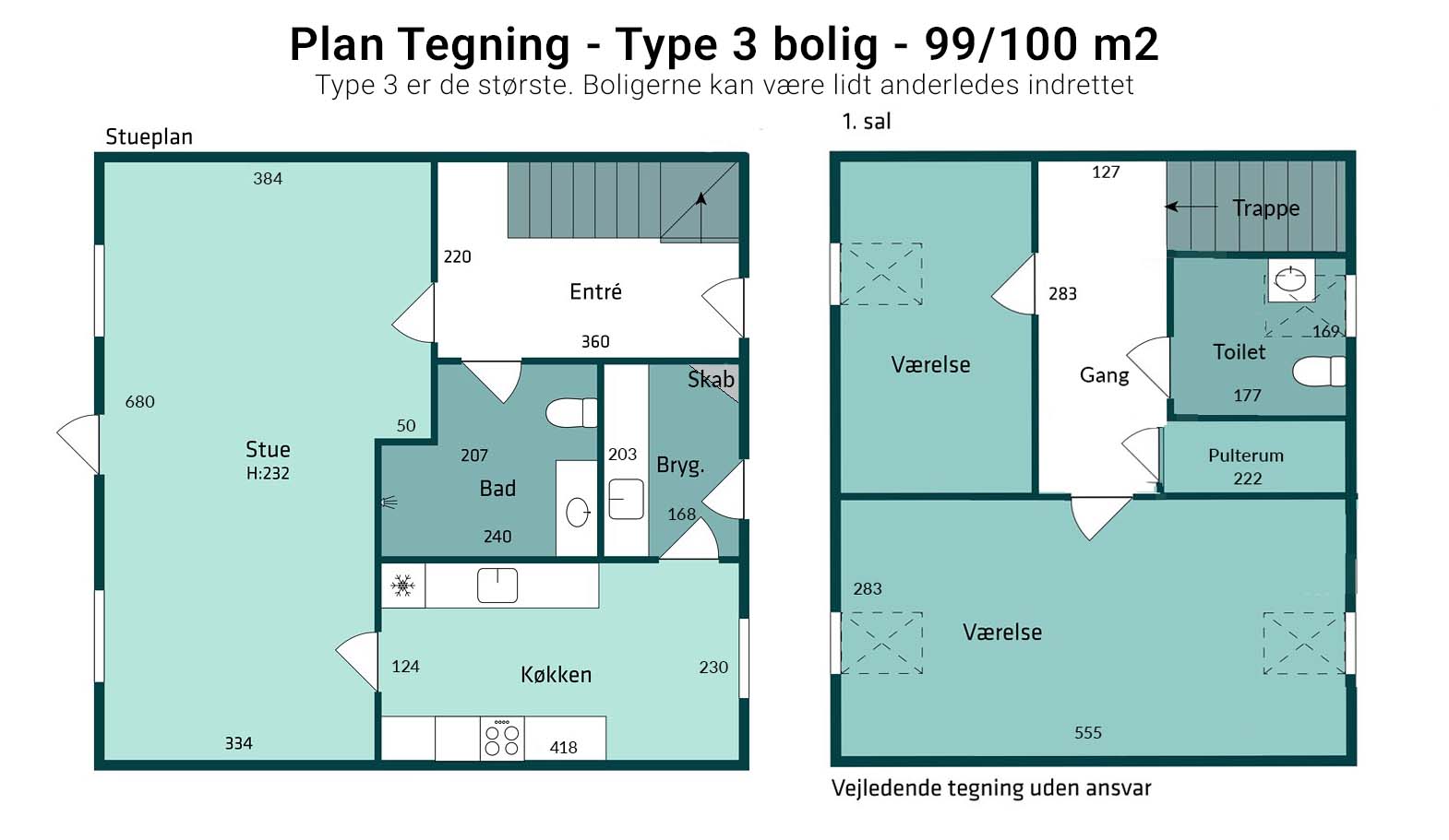 Vi har i alt 20 boliger i 1½ plan, på mellem 83 – 100 m2, fordelt på 8 bygninger med 2-3 boliger hver. Til hver bolig er egen baghave/terrasse samt en forgård og et skur. Desuden har vi fællesarealer med mose, græsplæner, veje, fortove og en parkeringsplads.